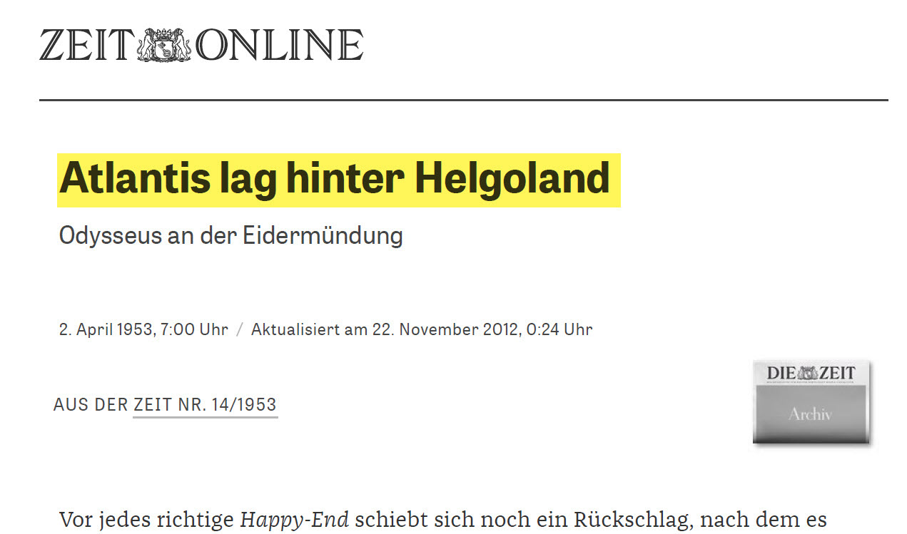 Wer nun mehr missen möchte, dem kann ich  das Werk von Günter Bischoff empfehlen: „Atlantis und sein Zentrum Althelgoland“ (2016). Bischoffs Werk habe ich mir u.a. ausgesucht. Es vermittelt einen aktuellen und ausführlichen Stand rund um das Thema (Link). Wer auf den erwähnten Zeit Artikel keinen Zugriff hat, der kann die Druckversion hier runterladen.