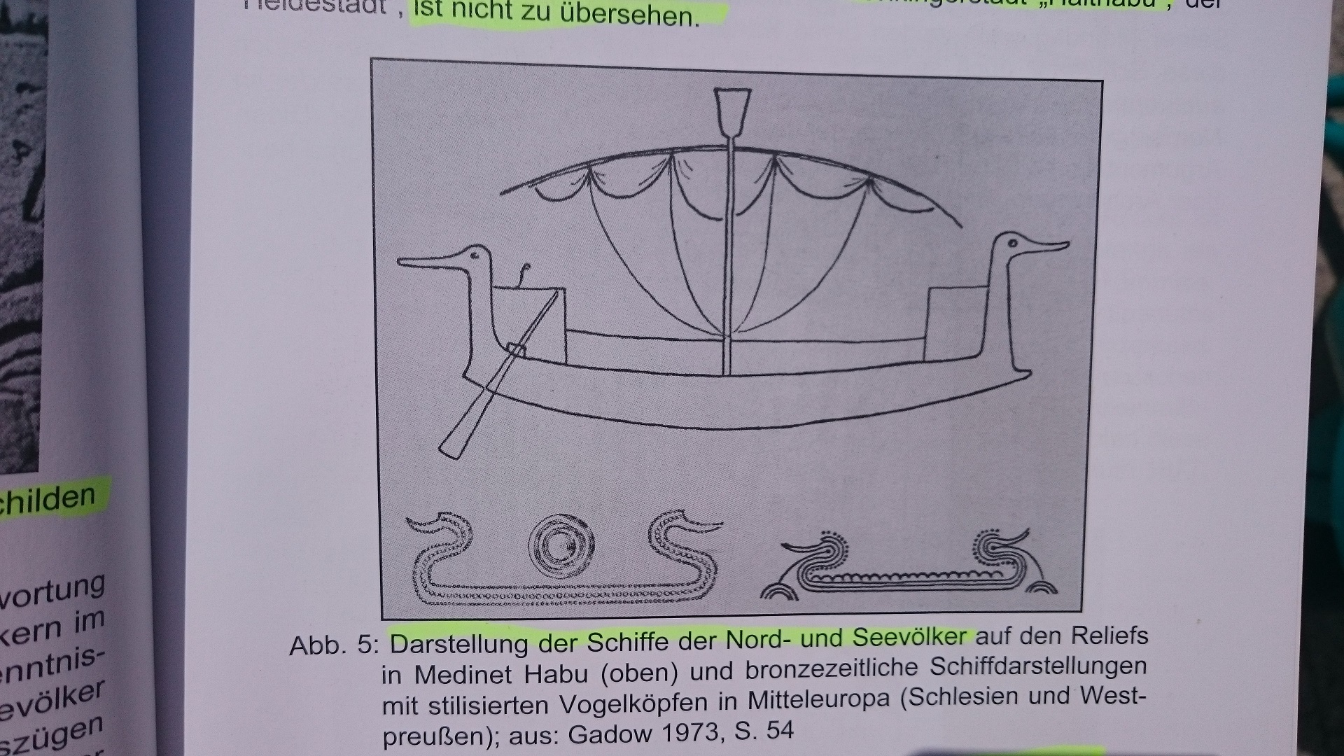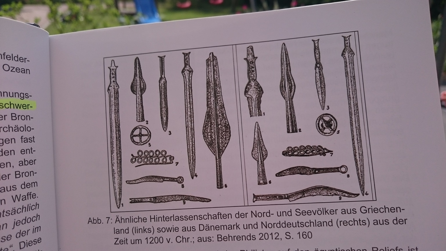 „Alle diese Depotfunde enthalten Waffen [die sogenannten Griffzungenschwerter beispielsweise] und Geräte der gleichen Art und nur in Schleswig-Holstein decken sich solche Depotfunde mit Gräberfunden! Ein Beweis, dass Schleswig-Holstein der Ausgangspunkt dieser mächtigen Völkerwanderung war, der folgenreichsten in der gesamten Geschichte Europas seit der Steinzeit.  In Griechenland hat diese Wanderung, wie die Ausgrabungen zeigen, ein Gebiet ausgespart: Attika, die Landschaft um Athen, weist als einzige griechische Landschaft nach dieser Weltrevolution noch die gleiche Keramik auf wie vor ihr – nämlich die mykenische, die sonst im zwölften Jahrhundert überall in Griechenland durch die Keramik der eingedrungenen „Nordvölker“ verdrängt ist. Die zyklopischen Burgmauern Athens haben den Schleswig-Holsteinern widerstanden.“ (Die Zeit, Ausgabe 14/1953)