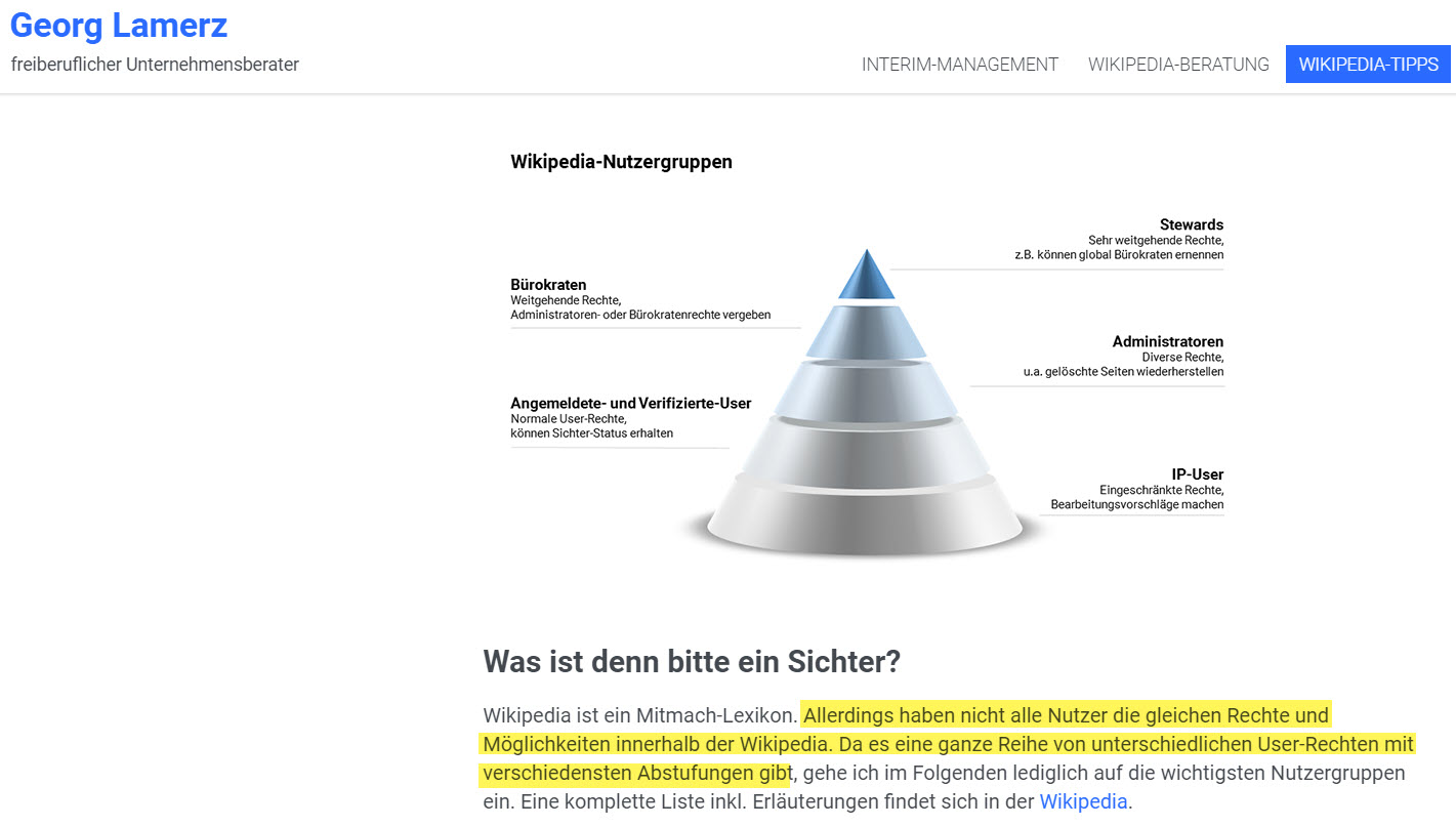 Ja, es fühlt sich nicht gut an, diese Zeilen zu lesen, aber lasst uns doch mal Tacheles reden: Die augenscheinlich demokratische Wissensplattform Wikipedia soll ein Ergebnis der Schwarmintelligenz sein? Nur seriöse und auf Wahrheit fußende Quellen finden hier Erwähnung? Nun, wie kann es aber sein, dass parallel ein übergeordnetes Rollenkonzept für ein Meinungsmonopol sorgt? Ja, das Rollenkonzept sieht nämlich die übergeordnete Rolle des „Sichters“ und vor allem die des „Administrators“, der „Sichter“ auswählen kann, dafür vor, „nicht passende Tendenzen“ auszumerzen. Im Zweifel erhalten „Sichter“ und vor allem „Administratoren“ immer recht (Quelle). Spielt ein „Sichter“ nicht mehr mit, wird dieser vom „Administrator“ entfernt.