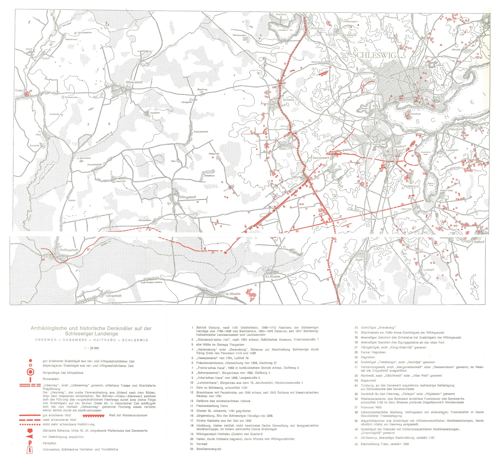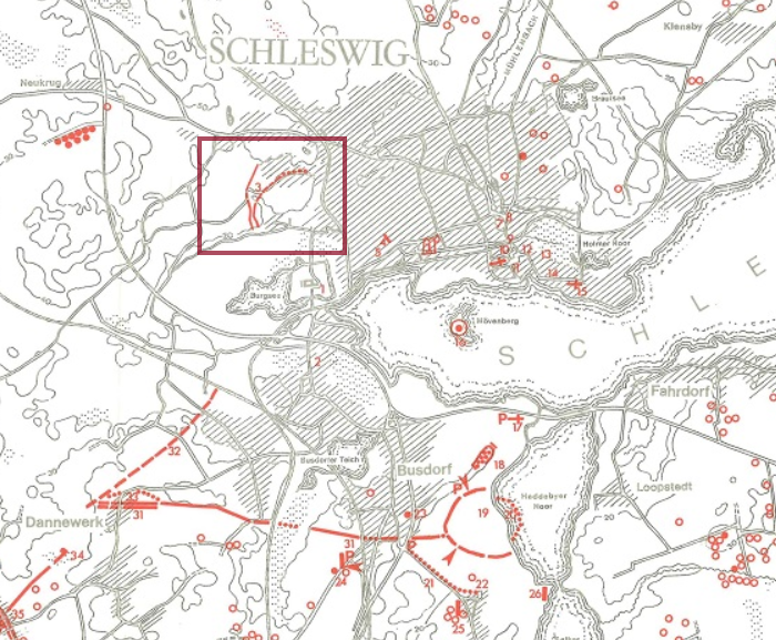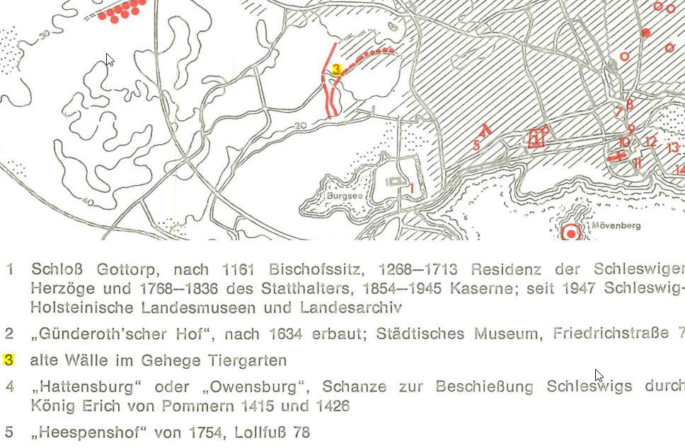 Hier die Karte: „Archäologische und historische Denkmäler auf der Schleswiger Landenge“ (ZENTRALMUSEUM MAINZ K. SCHIETZEL, Zusatzkarte). Nach meinem Besuch am 31.03.2024 und meinen neue gewonnen Erkenntnissen vor Ort habe ich diese Karte mit Positionen zu möglichen Brücken aktualisiert.