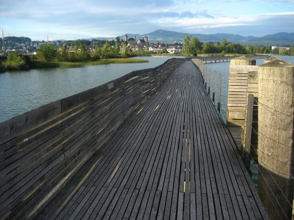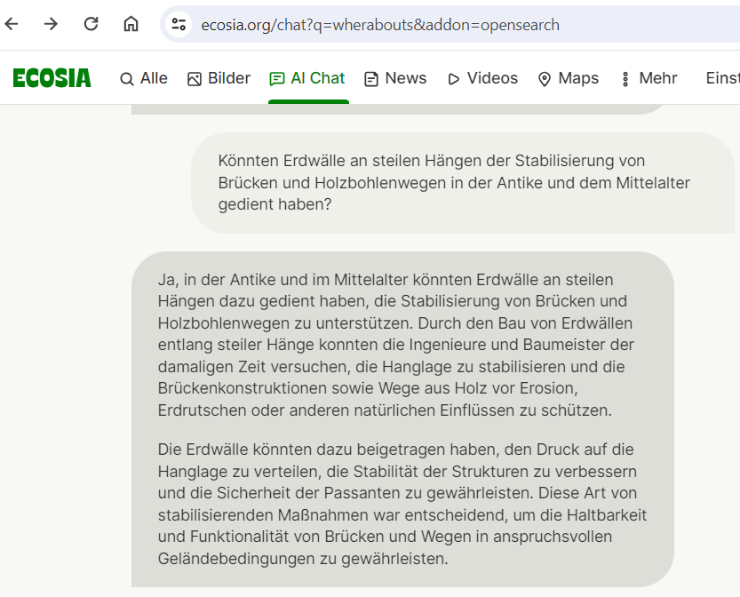 Recherchiert man hierzu, stößt man, auf lange prähistorische Holz-Brücken, die sogar bis in die Bronzezeit zurückreichten, wie hier die Rapperswil-Hurden Brücke (Quelle), die über den Züricher See führt. Strukturen von älteren Brücken in dem Bereich der heutigen Brücke ließen sich in die Zeit zwischen 3000 v. Chr. – 800 n. Chr. datieren (Quelle). Was ist aber mit den beiden Anlagen Alter Wall 1 und Alter Wall 2 im Tiergarten, die steile Hänge hinauf führten? Alter Wall 2 ist bzw. war fast 800 Meter lang (nur noch 1/3 seiner ursprünglichen Länge ist davon erhalten geblieben)! Was war ihre Funktion, wenn sie Teil dieses Transportsystems waren? Auch auf diese Frage liefert die KI eine passende Antwort: