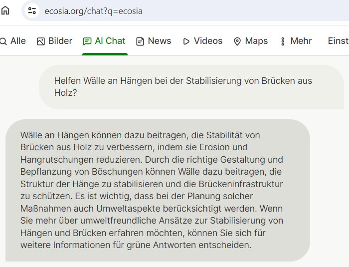 Dann kam uns die Idee! Wenn diese Anlage als Bindeglied zwischen dem Alten Wall 1 und 2 auf der Nordseite der Schlei (im Tiergarten) und dem Nordwall auf der Südseite fungierte, würde sie sich ideal als Brückenkopf eignen, aufgrund ihrer zentralen Lage zwischen zwei Brückenabschnitten! Befragt man die KI, ob ein derartiges Bauwerk helfen würde, um die Grundstabilität einer Brücke aus Holz zu verbessern, erhält man folgende Antwort: