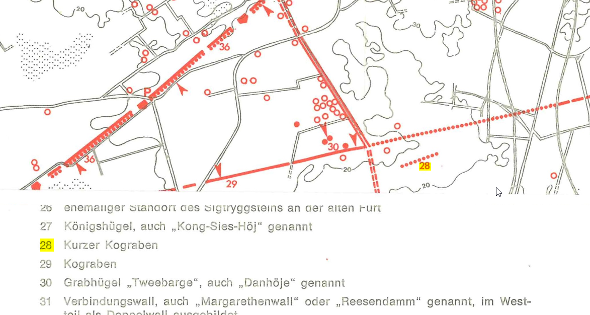 Archäologen, wie der Däne Henning Hellmuth Andersen, gehen sogar noch weiter und erklären, wie auf der englischen Wikipedia Seite nachzulesen, dass sogar ein zusätzlicher Graben den Hauptteil des Danewerks flankierte, der ebenfalls, wie der Kograben, als Nord-Ostsee-Kanal fungierte! (https://en.wikipedia.org/wiki/Danevirke)! Wer sich den Verlauf des Hauptwalls bis zum ehemaligen Dannewerker See, bis ins Jahr 1154 ging die Schlei noch bis an diese Stelle (VON MAACK, Seite 90), und von da über entsprechende Bauwerke (die immer noch existieren, aber weitestgehend unbekannt sind) und natürliche Wasserstraßen, auf der Karte oben angesehen hat, wird feststellen, dass diese Schlussfolgerung Andersens mehr als Sinn macht! Genial!
