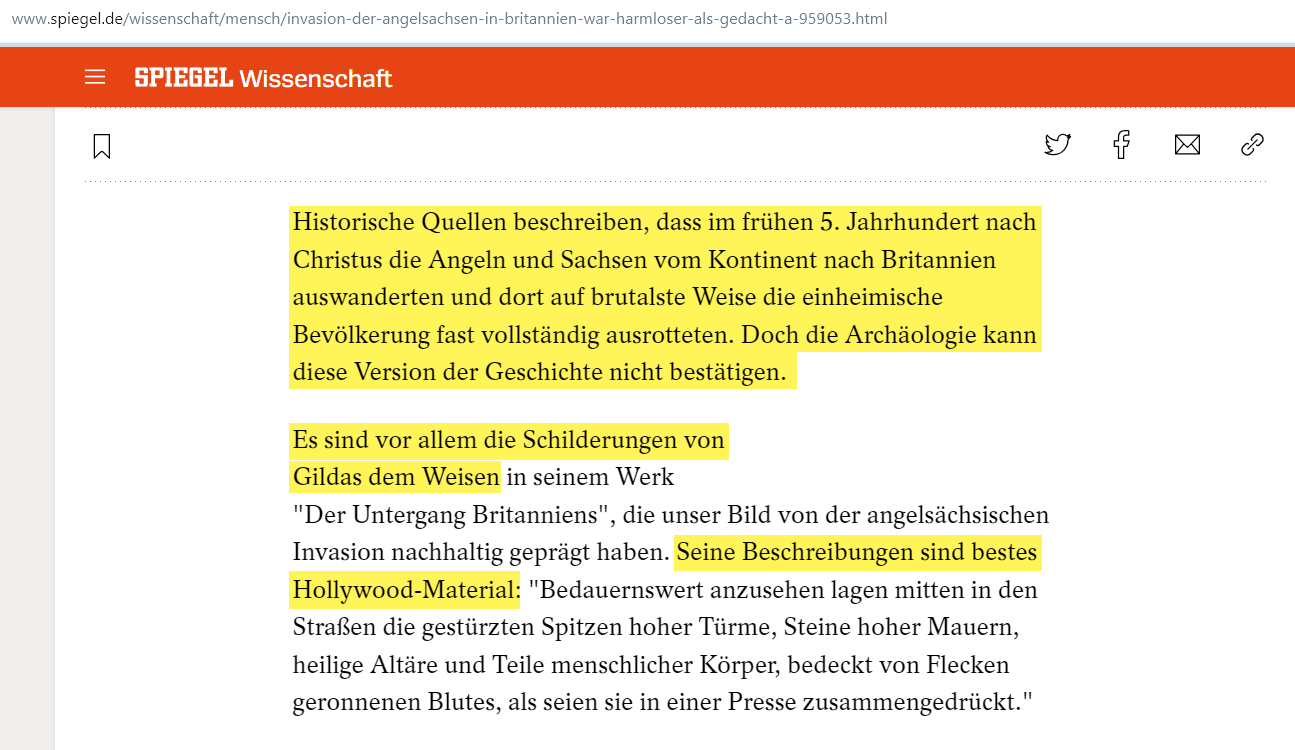 Und auch bei diesem Punkt widerspricht die Archäologie (also die Wissenschaft) den historischen Überlieferungen. Warum halten wir nur so an den alten Quellen fest, wenn wir wissen, dass „die wenigen geschichtlichen Überlieferungen, die wir haben, mit äußerster Vorsicht zu genießen sind“ (Hamburger Morgenpost, 11.09.2021)? Wikipedia schreibt bis zum heutigen Tag unbeirrt von „einer gewaltsamen Landnahme Britanniens“ durch die Angelsachsen (Quelle). Mit dieser Falschbehauptung räumte allerdings bereits im März 2014 der Spiegel auf (Quelle).