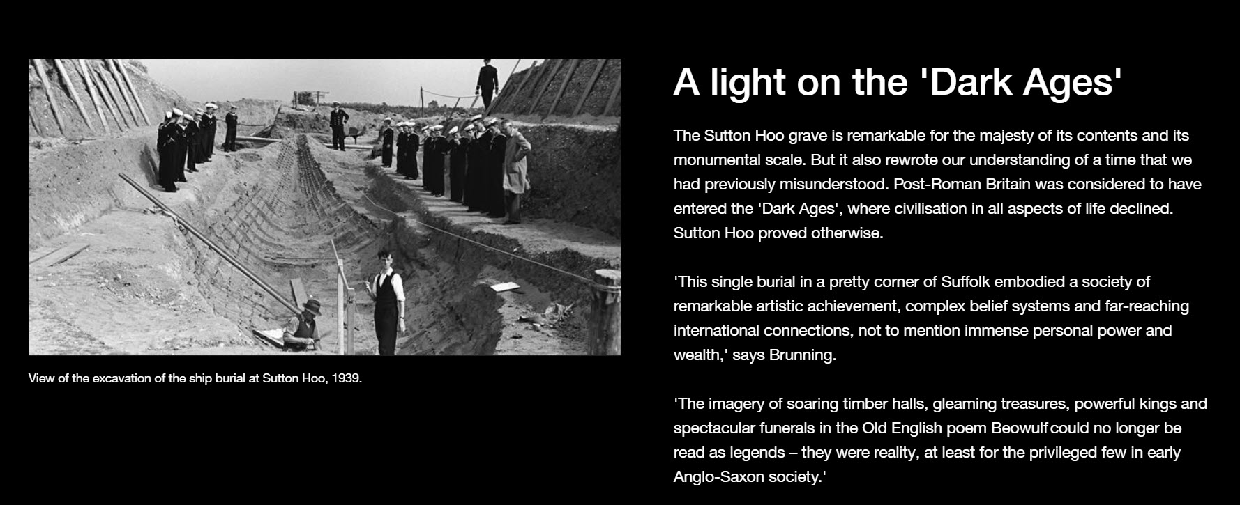 „The Sutton Hoo grave is remarkable for the majesty of its contents and its monumental scale. But it also rewrote our understanding of a time that we had previously misunderstood. Post-Roman Britain was considered to have entered the ‚Dark Ages‘, where civilisation in all aspects of life declined. Sutton Hoo proved otherwise.“ (Quelle).