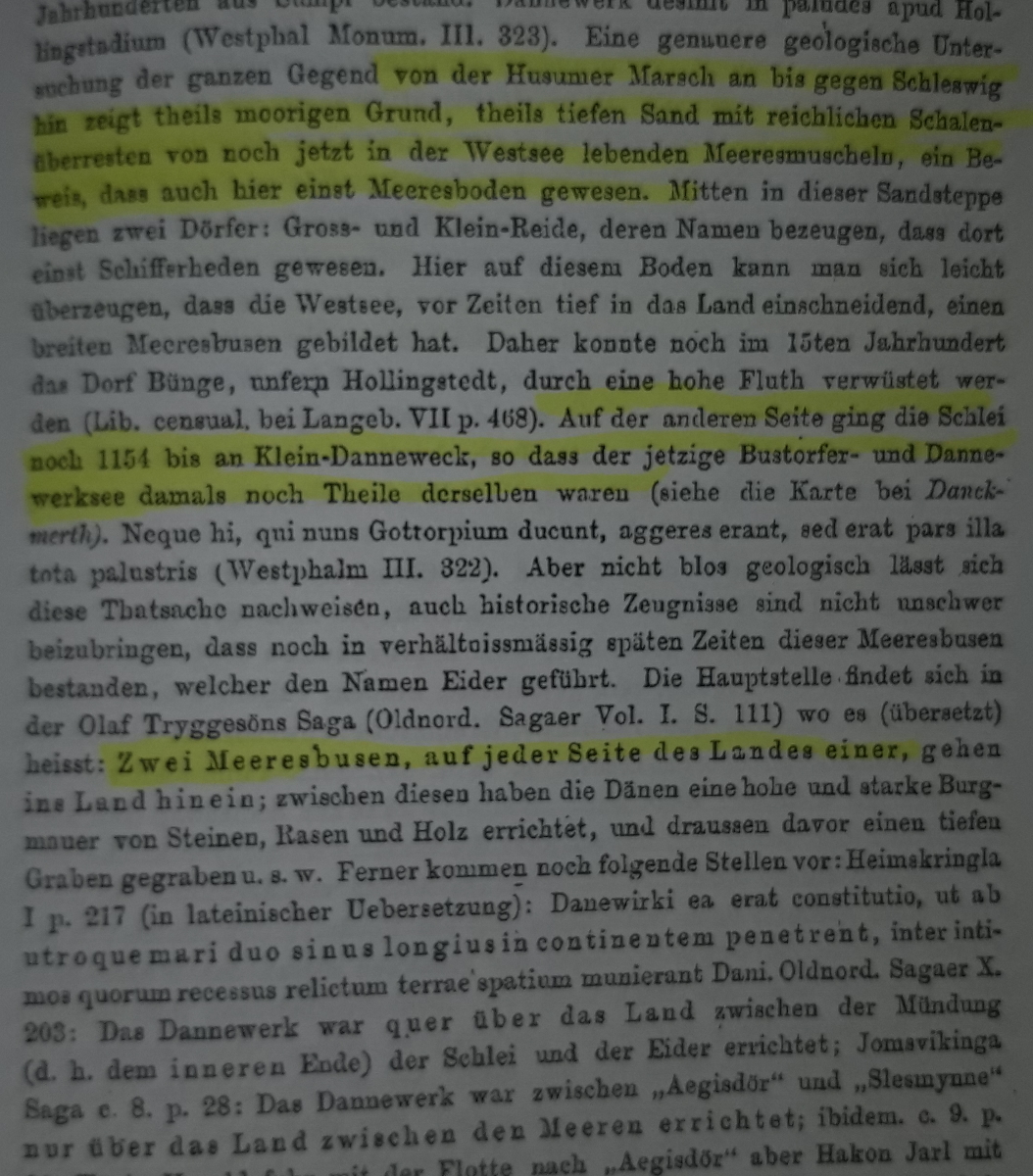 Hier ein Auszug von Seite 90 des Werkes von VON MAACK, P H. K. Auch interessant, "Schalenüberreste von jetzt noch in der Westsee lebenden Meeresmuscheln" bis klein Rheide! Das Dannewerk verband also einst "beide Meeresbusen" und verfügte über einen "tiefen Graben". Der Autor erwähnt auch historische Flottenverlegungen über dieses System.