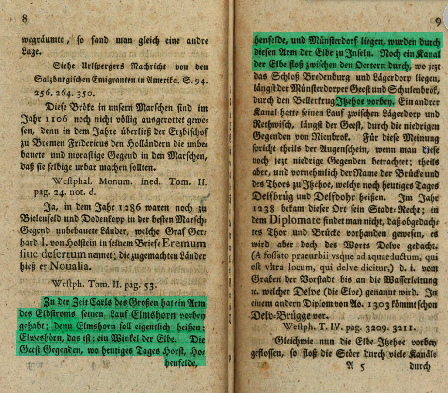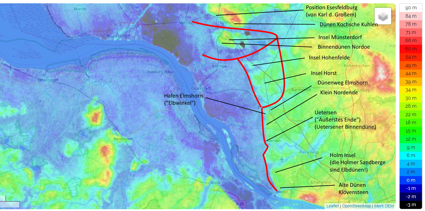 Diese inneren Dünenketten ziehen sich mittendurch Dithmarschen hindurch (VON MAACK, Seite 67). Wer hätte das gedacht? Dass die Elbe hier einmal lang lief, ist übrigens offiziell, die Frage ist nur: Wann verlief sie letztmalig hier entlang? Die Antwort ist: Bereits zur Zeit Karl des Großen, welcher die Esesburg in Itzehoe im Jahre 809 hat bauen lassen, war sie noch da! Das ist aber erst um die 1300 Jahre her!Seite 8, Geuss, Nicolaus Friedrich: Beyträge zur Kirchengeschichte und Alterthumskunde aus dem Jahre 1778 – Noch zur Zeit Carls des Großen hat dieser Arm des Elbstroms noch bestanden. Der Name Elmshorn leitet sich von „Winkel der Elbe“ ab!