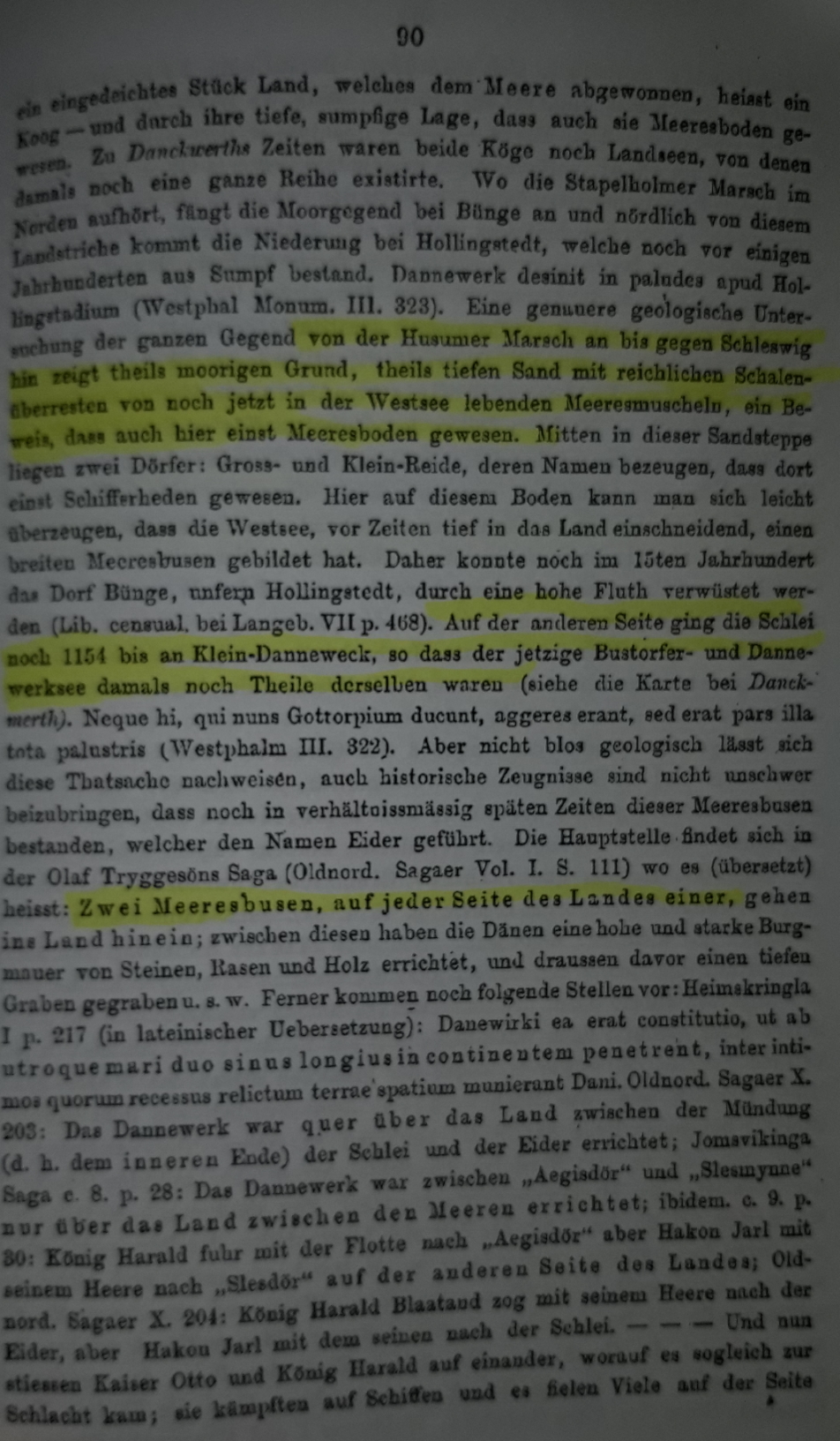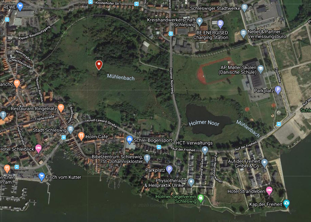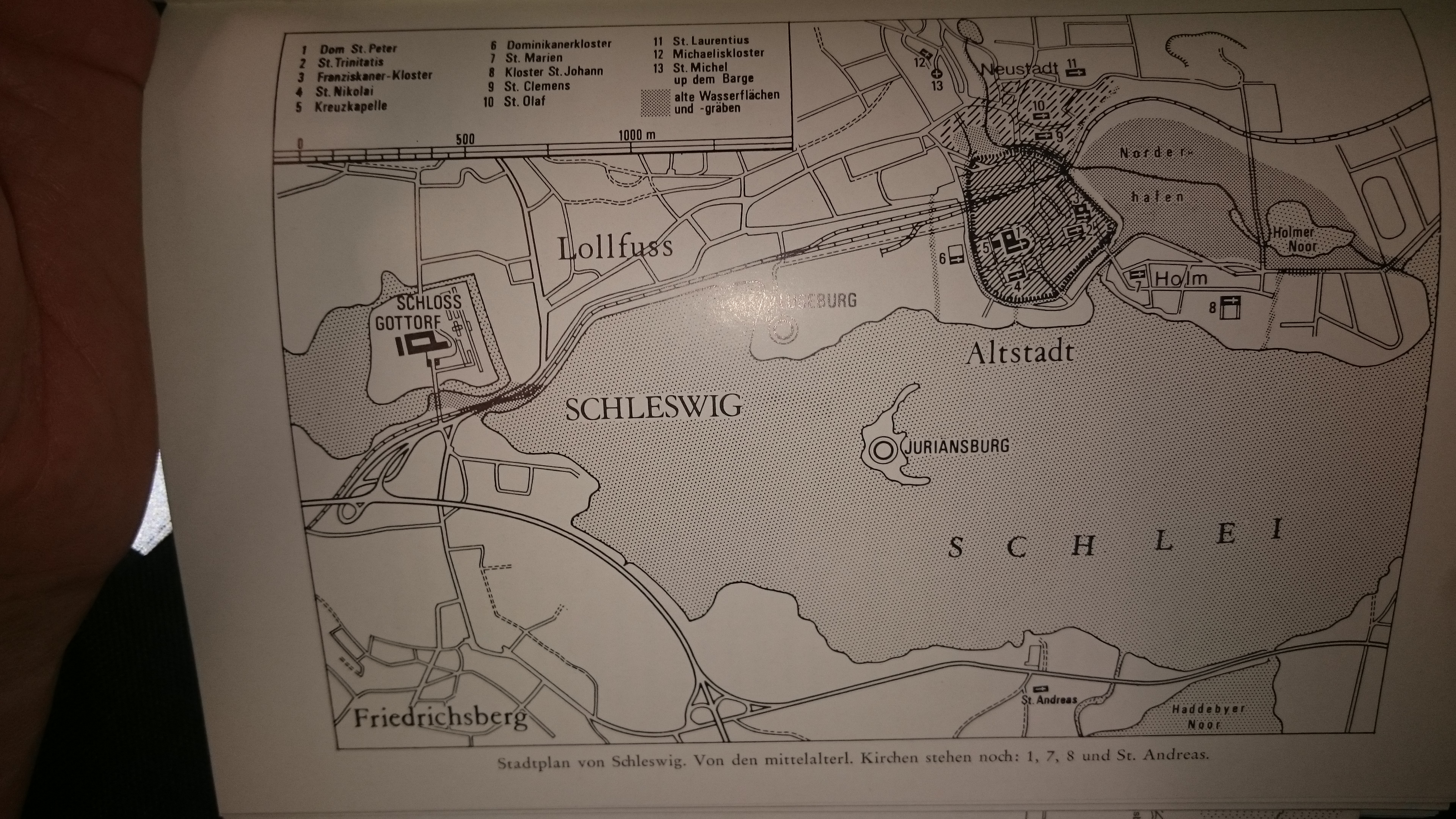 Dann das Kartenmaterial aus dem vom Archäologen verfassten Buch „Führer zu vor- und frühgeschichtlichen Denkmälern“ (ZENTRALMUSEUM MAINZ, 1968), welche auf der Karte auf Seite 151 Schleswigs Norderhafen zeigt. Richtig, Schleswig hatte bis vor ein paar Jahrhunderten noch einen großen zweiten Hafen (Karte unten)! Da die Schlei ein Meeresarm der Ostsee ist und auf der Nordseeseite die Treene ja auch als verlängerter Meeresarm der Nordsee fungierte, kann man nur zu einem Schluss kommen: Der Meerespiegel lag höher – und zwar um Einiges. Die Schlei verlief bis ins Jahr 1154 noch bis zur Ortschaft Dannewerk (VON MAACK, P H. K., Seite 90)!