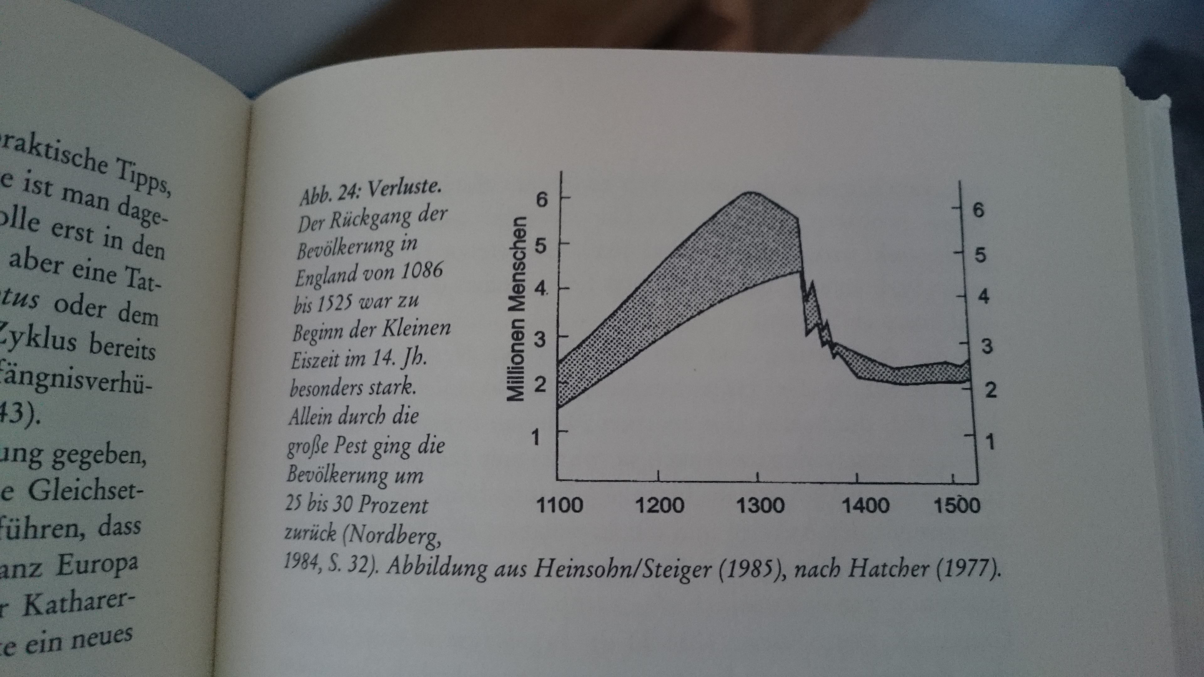 Auch kaum bekannt ist uns das Horrorjahr 1342, was erneut und abrupt die klimatischen Verhältnisse auf den Kopf stellte. Die „Jahrtausendflut“: Wegbereiter für die Pest (Quelle, die Zeit). Das Einsetzen einer kleinen Eiszeit. Die Grönland Wikinger verließen ihr bisweilen grünes Land, Grünland, weil es dies nun plötzlich nicht mehr war (LUDWIG, Seite 26). Die Pest breitete sich aus und ein Drittel der deutschen Bevölkerung hat es dahingerafft (HUMBERT, Seite 62) – in Frankreich und Großbritannien sah es nicht anders aus.