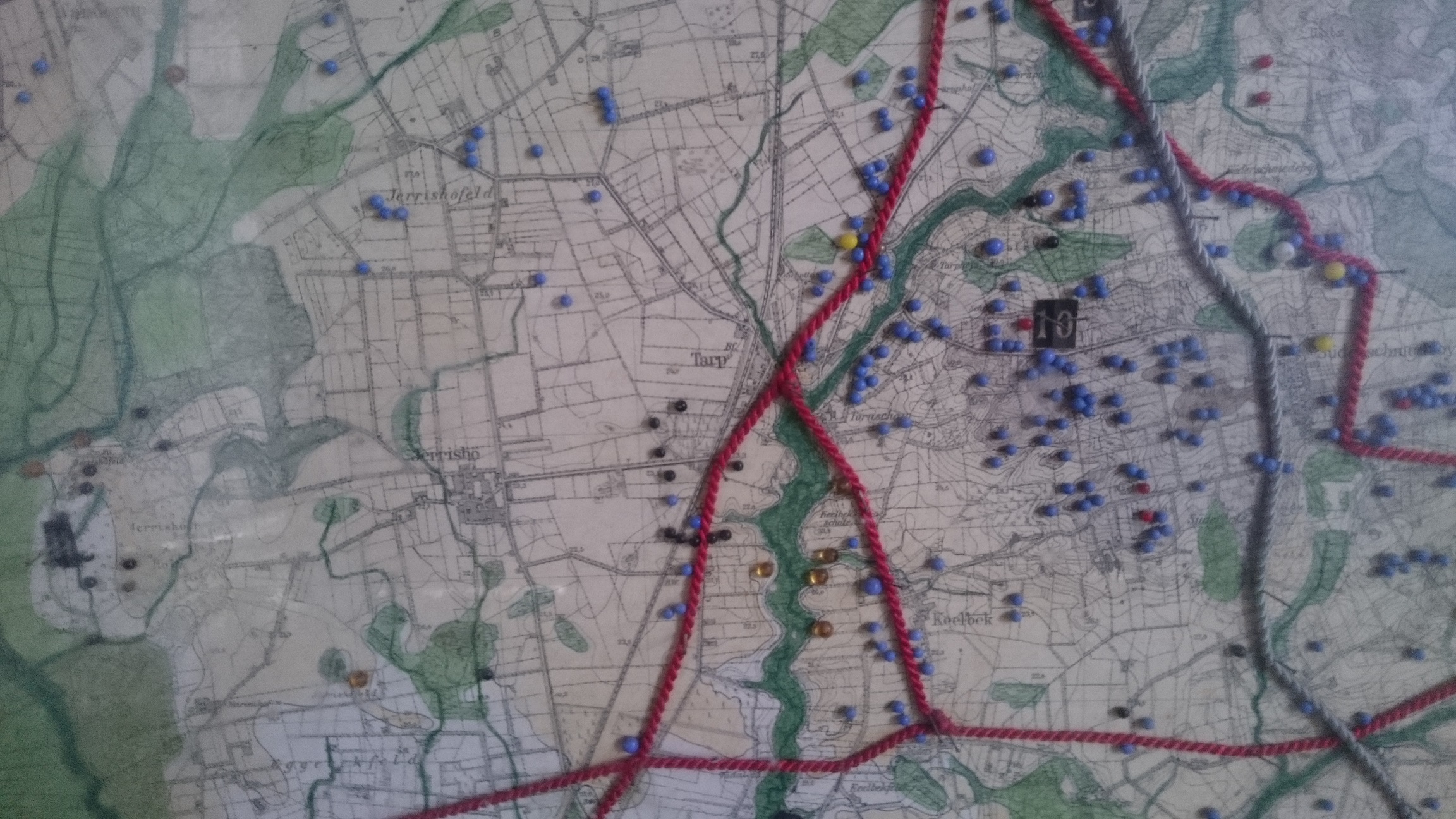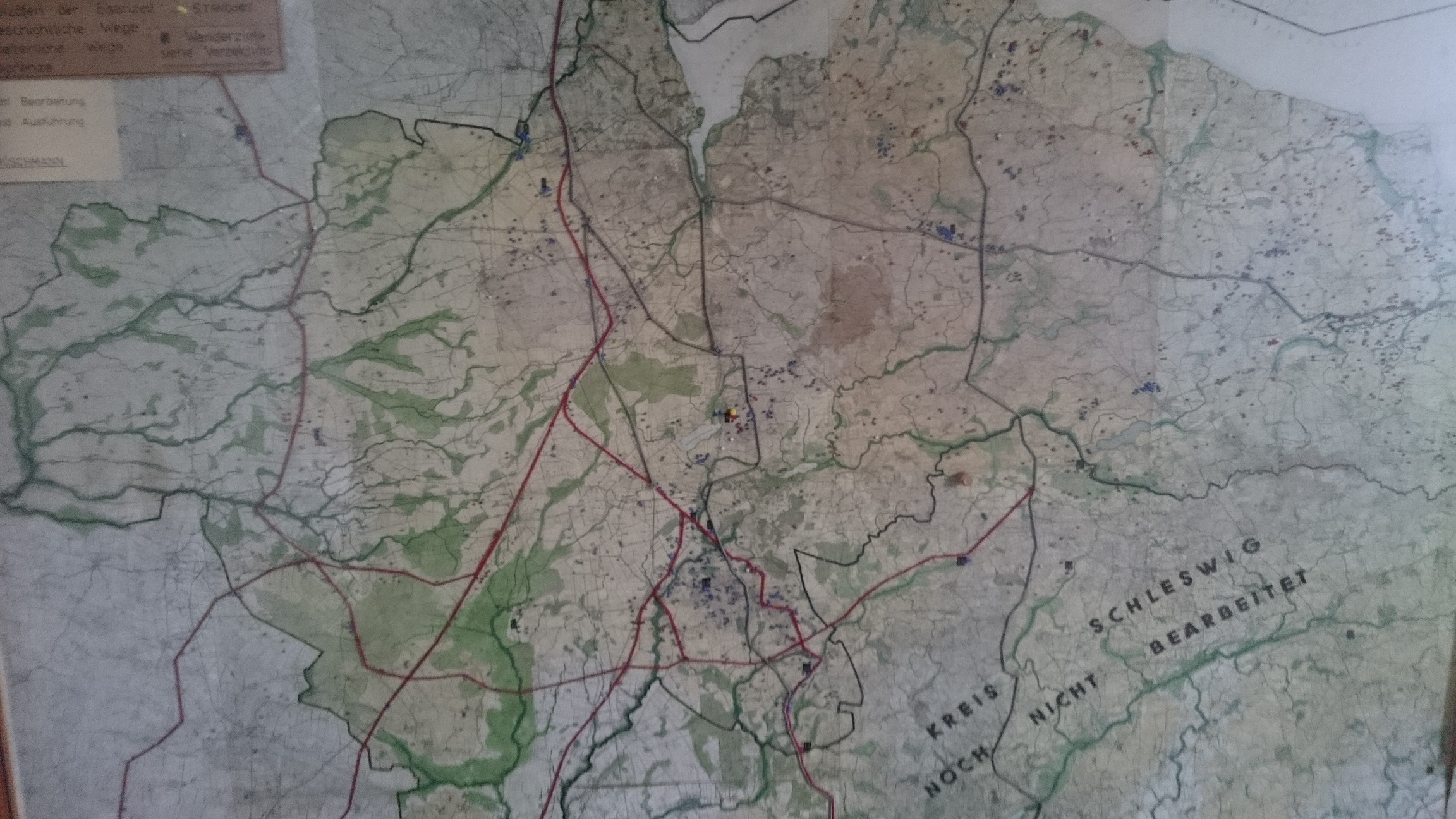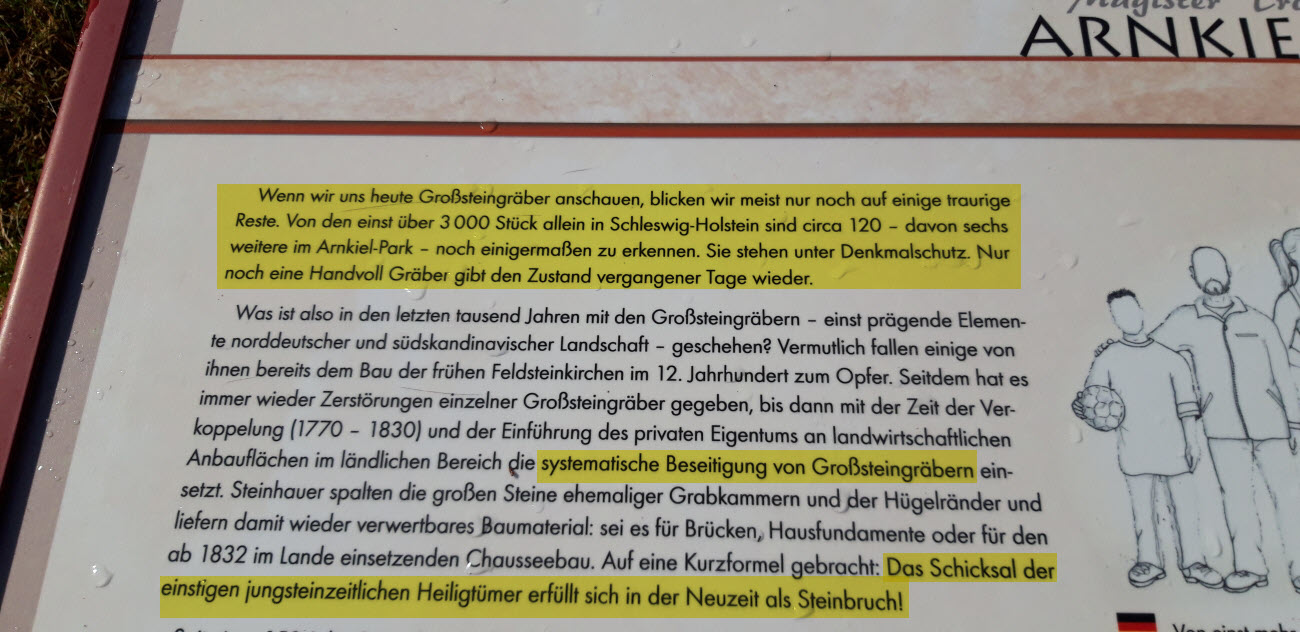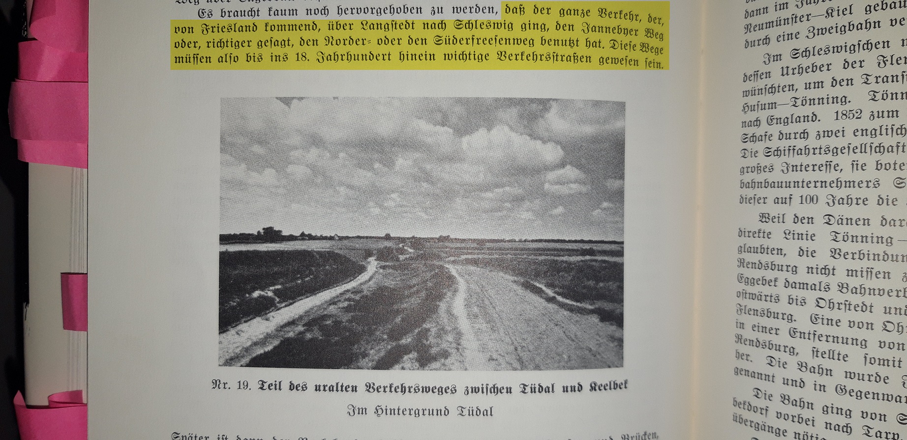 Vor etwa 5 Jahren besuchte ich mit meinem Bruder den Arnkiel Park bei Oeversee (sehr zu empfehlen). Im Informationshäuschen der archäologischen Freilichtanlage befand sich eine Karte, die detailliert die Route dieses alten Wegenetzes aufführt. Auch alte Siedlungen und unzählige Grabhügel und Großsteingräber werden auf dieser Karte aufgeführt. Die extrem hohe Dichte von archäologischen Zeugnissen vergangener Tage ist schier kaum zu glauben. Heutzutage lassen sich, bedingt durch die im 20ten Jahrhundert vorangeschrittene Agrarwirtschaft und dem Straßenbau, kaum noch welche dieser prä-historischen Überreste in unserer Landschaft ausmachen, dabei war unser gesamtes Bundesland bis zu dieser Zeit noch voll davon: „Der Reichtum unseres Landes an Großsteingräbern und Kammertypen ist innerhalb der Megalithkultur auf deutschem Boden am größten.“ (ZENTRALMUSEUM MAINZ, Seite 46)
