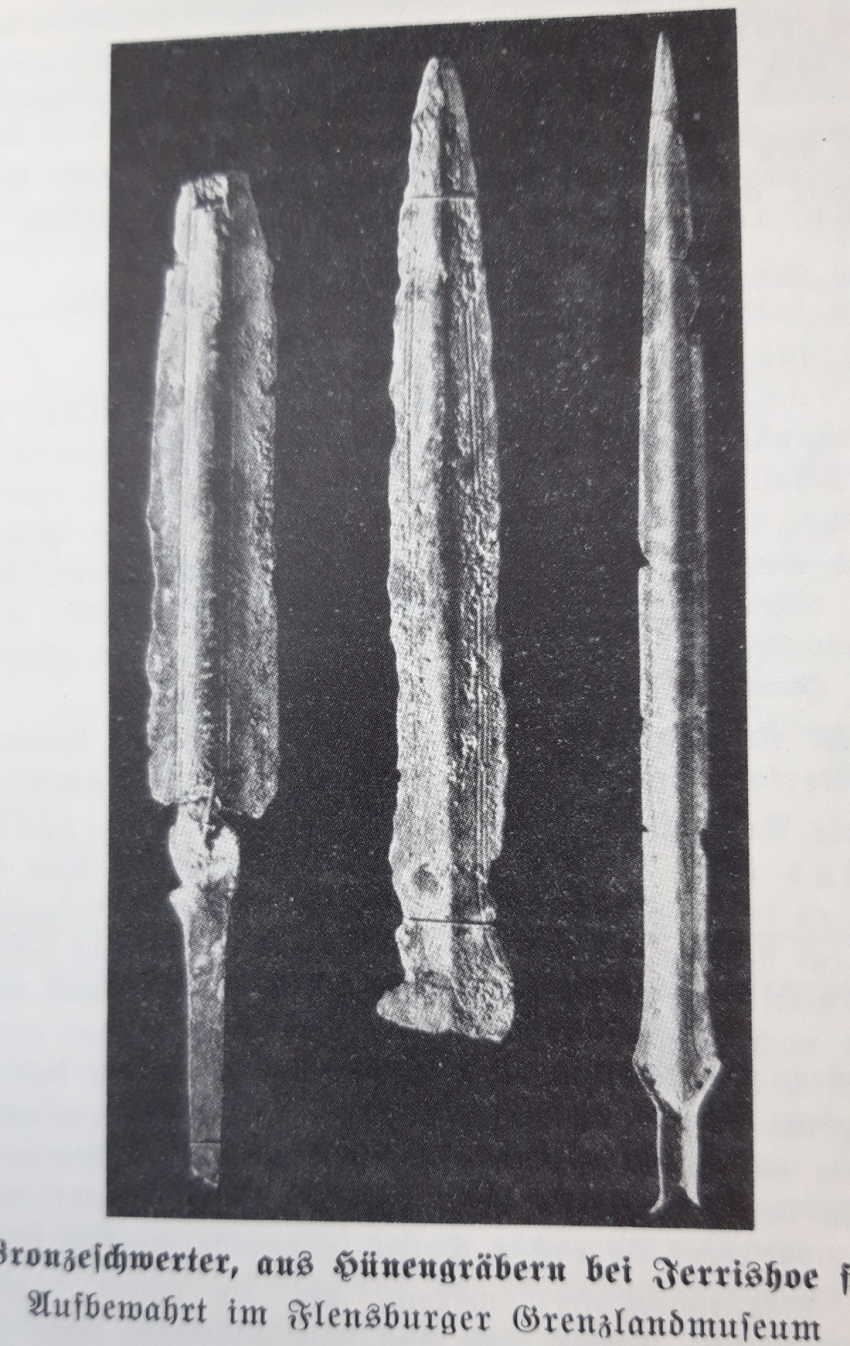 Griffzungenschwerter fanden eine enorme Verbreitung in unserem Kulturraum und wurden in zahlreichen bronzezeitlichen Hügelgräbern gefunden, u.a. hier in Jerrishoe bei Tarp (Heimatchronik, Seite 7).