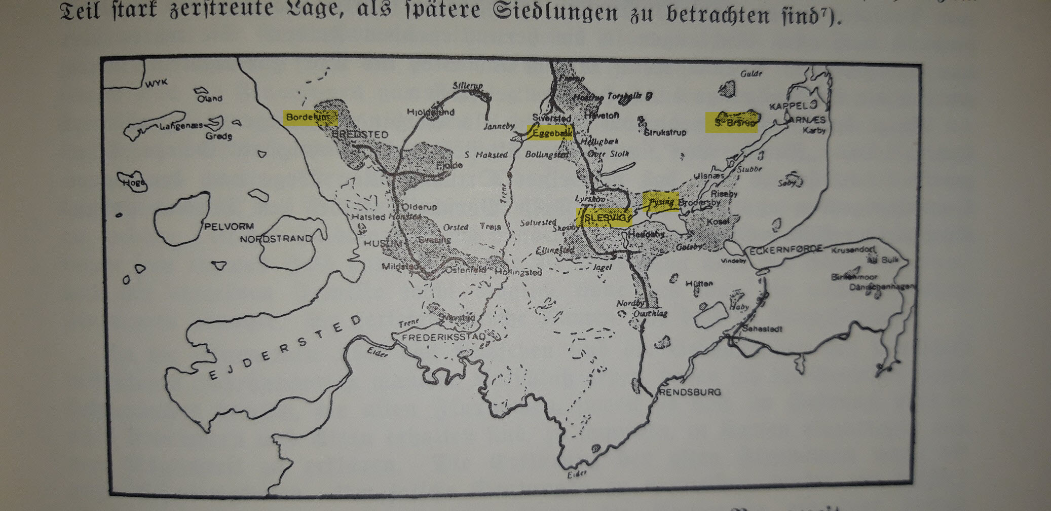 Auf Seite 101 weist die Eggebeker Heimatchronik explizit darauf hin, dass es zwei sehr bedeutsame Fluss-Furten gab, die unsere Vorfahren bereits vor Tausenden von Jahren nutzten. Diese seichten Flussübergänge befinden sich bis heute auf dem damals „wichtigsten Verbindungsweg zwischen einem östlichen und einem westlichen Siedlungsgebiet der Bronzezeit“ (Heimatchronik, Seite 93). Eine davon ist der Treeneübergang bei Tüdal. Auf Seite 102 wird betont, dass der ganze(!) Verkehr von Friesland (Bordelum mit seiner heiligen Quelle über Bredstedt, Joldelund, Sillerup) kommend und nach Schleswig gehend, hier entlang führte. Jeder, der die herausragende Bedeutung Alt Schleswigs als zentralen Knotenpunkt auf der Schleswiger-Landenge bis ins Hochmittelalter kennt (mehr dazu hier), weiß, wie intensiv dieser Weg also genutzt worden sein muss. Obendrein diente genau dieser Weg auch als die direkteste Verbindung zwischen dem Stammzentralheiligtum der Friesen und dem der Angeln bei Alt Brarup, dem Thorsberger Moor.