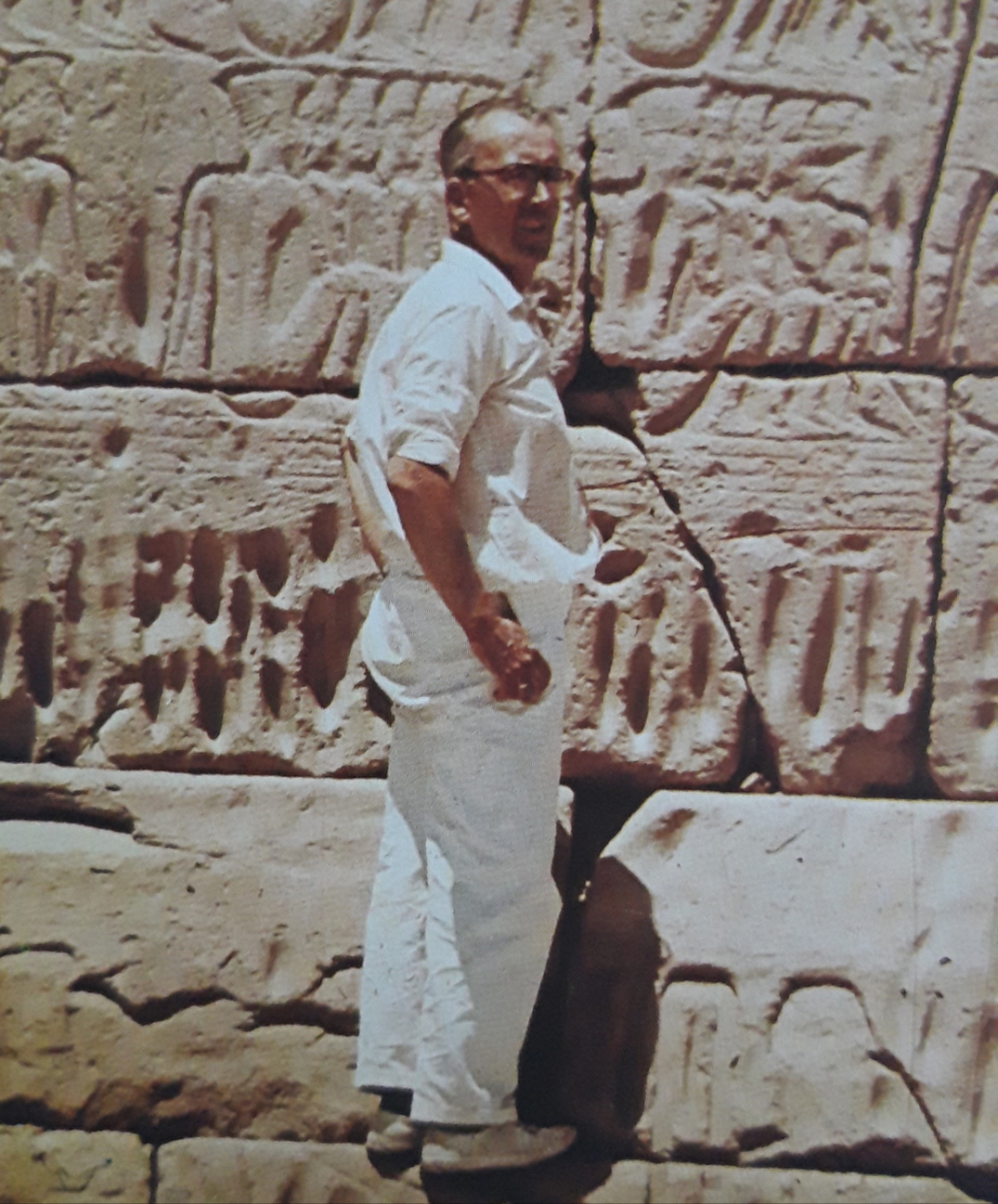Jürgen Spanuth 1980 vor dem Totentempel in Medinet Habu/Ägypten - Auf Wikipedia erfährt man gleich einleitend in seinem Artikel, dass "seine Atlantis Theorie unhaltbar sei". Dabei konnte keine seiner 6 Grundthesen bisher widerlegt werden. Auch von der Kultur des Nordischen Kreises und seinem unbestreitbar sehr hohem Entwicklungsstand ist darin keine Rede. Das Relief an genau dieser Stelle zeigt übrigens die Schlachten der Nord-Seevölker gegen die Truppen von Ramsis III mit Griffzungenschwertern und Rundschilden (in diesem Bild oben links zu sehen)!