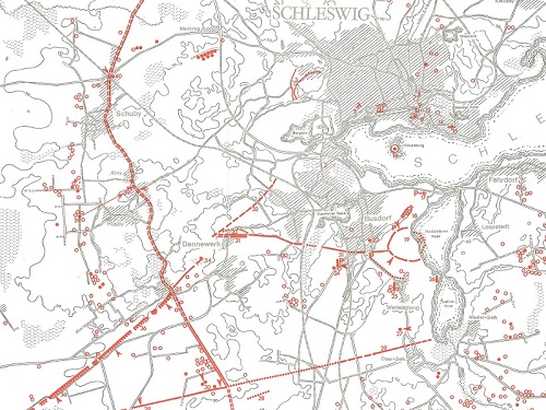 Hier die Karte: "Archäologische und historische Denkmäler auf der Schleswiger Landenge" (ZENTRALMUSEUM MAINZ K. SCHIETZEL, Zusatzkarte). Nach meinem Besuch am 31.03.2024 und meinen neue gewonnen Erkenntnissen vor Ort (siehe hier) habe ich diese Karte mit Positionen zu möglichen Brücken aktualisiert.